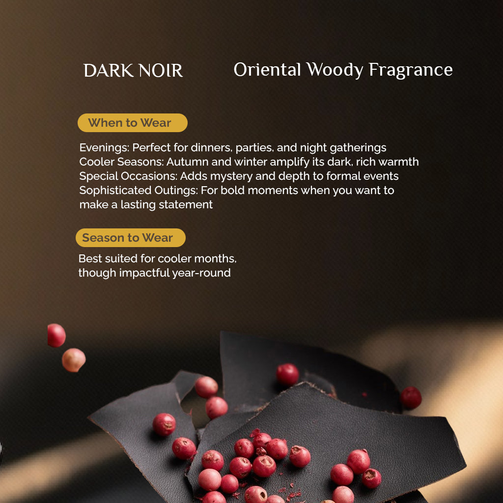 Dark Noir is an intoxicating fragrance of mystery and seduction. It opens with rich notes of black leather and pink pepper, unfolding into a heart of vanilla, tonka bean, Haitian vetiver, and ambergris. Anchored by deep tobacco, Cambodian oud, patchouli, and tiare flower, it exudes confidence, allure, and strength. A fragrance made for the man who commands attention without a word.