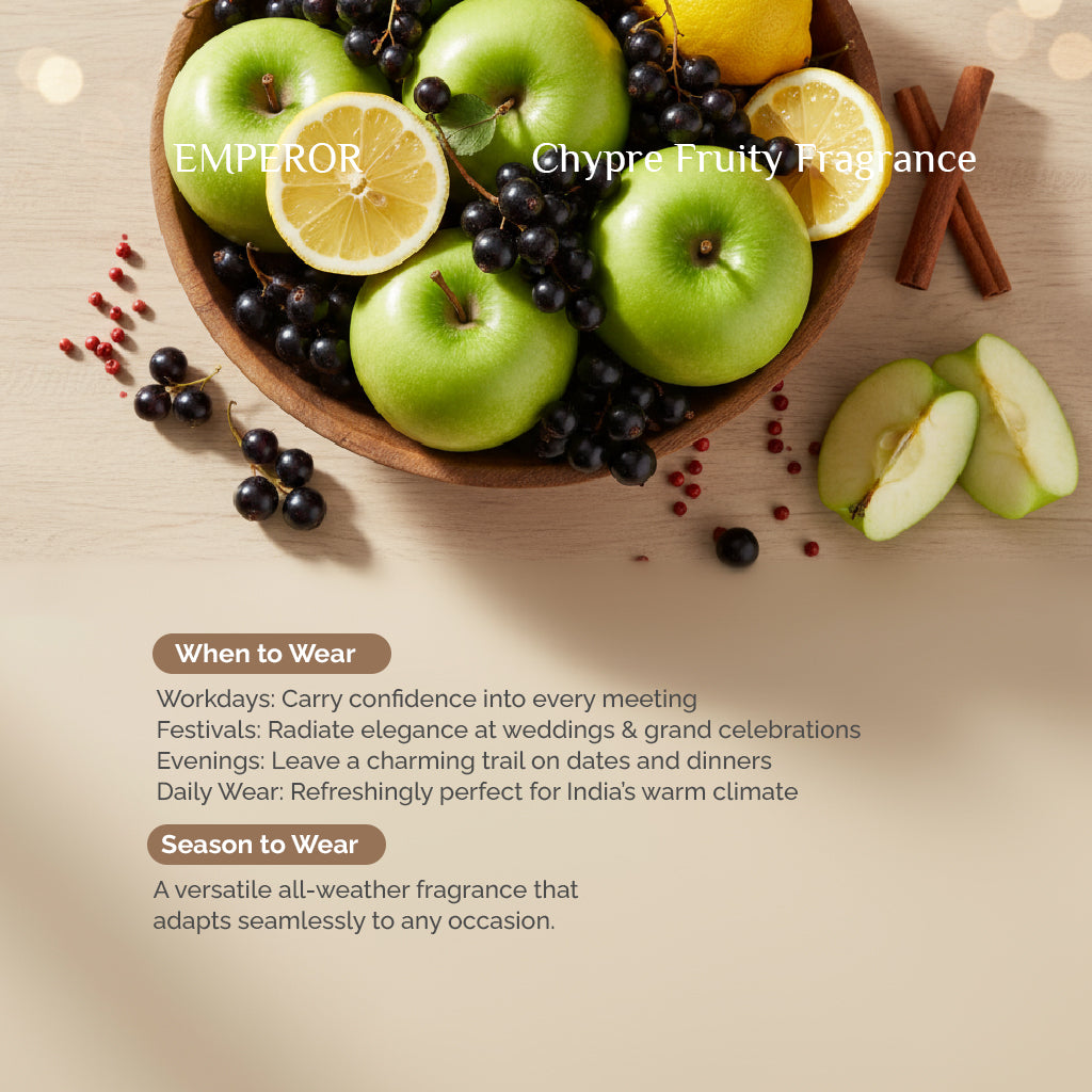 Emperor is a refined chypre-fruity creation designed for the modern gentleman who exudes quiet power. It opens with a bright burst of bergamot, apple, black currant, lemon, and pink pepper, evoking freshness and charisma. The heart reveals pineapple, patchouli, and jasmine, adding a smooth, elegant warmth, before settling into a base of birch, cedarwood, musk, oak moss, and ambergris. Each note is carefully balanced to create a scent that lingers with understated authority and timeless charm.